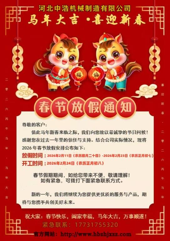 马年春节进入倒计时中,新年之际公司特通知全体员工放假,感谢大家过去一年的辛勤付出与努力,感恩新老客户的支持与信赖,新的一年我们期待能够一直携手前行,共创辉煌。河北中浩机械全体员工预祝大家马年快乐,马上发财,阖家幸福。
